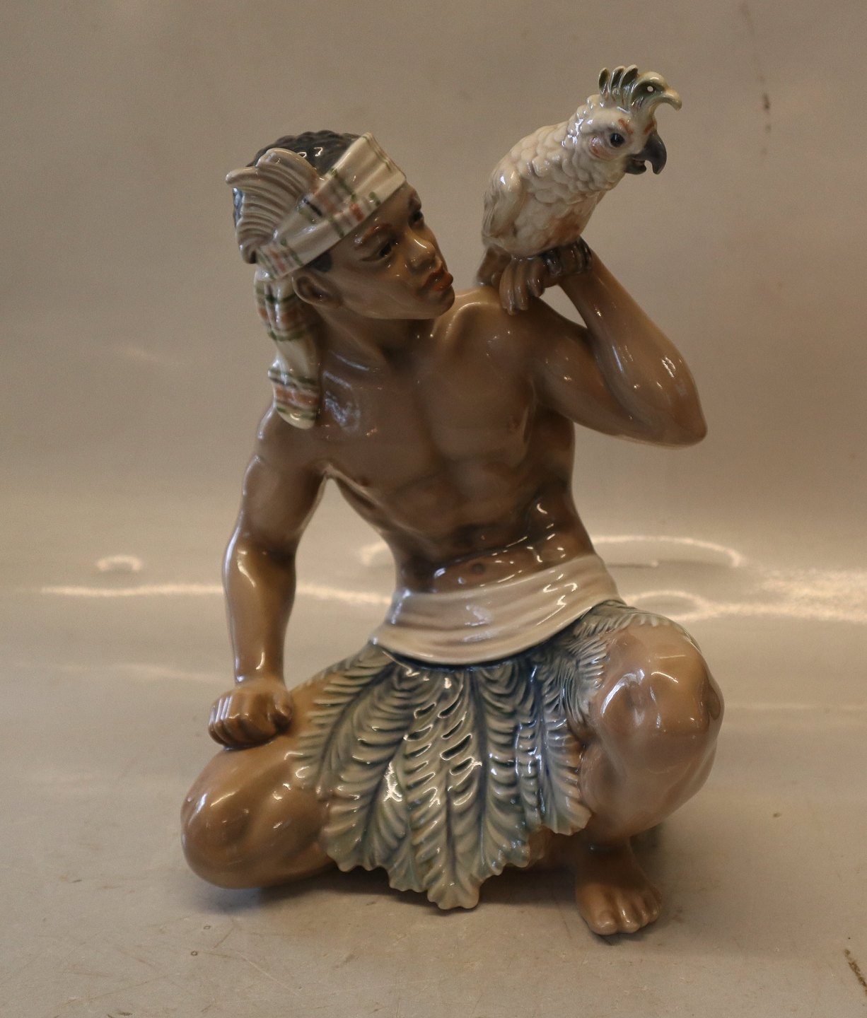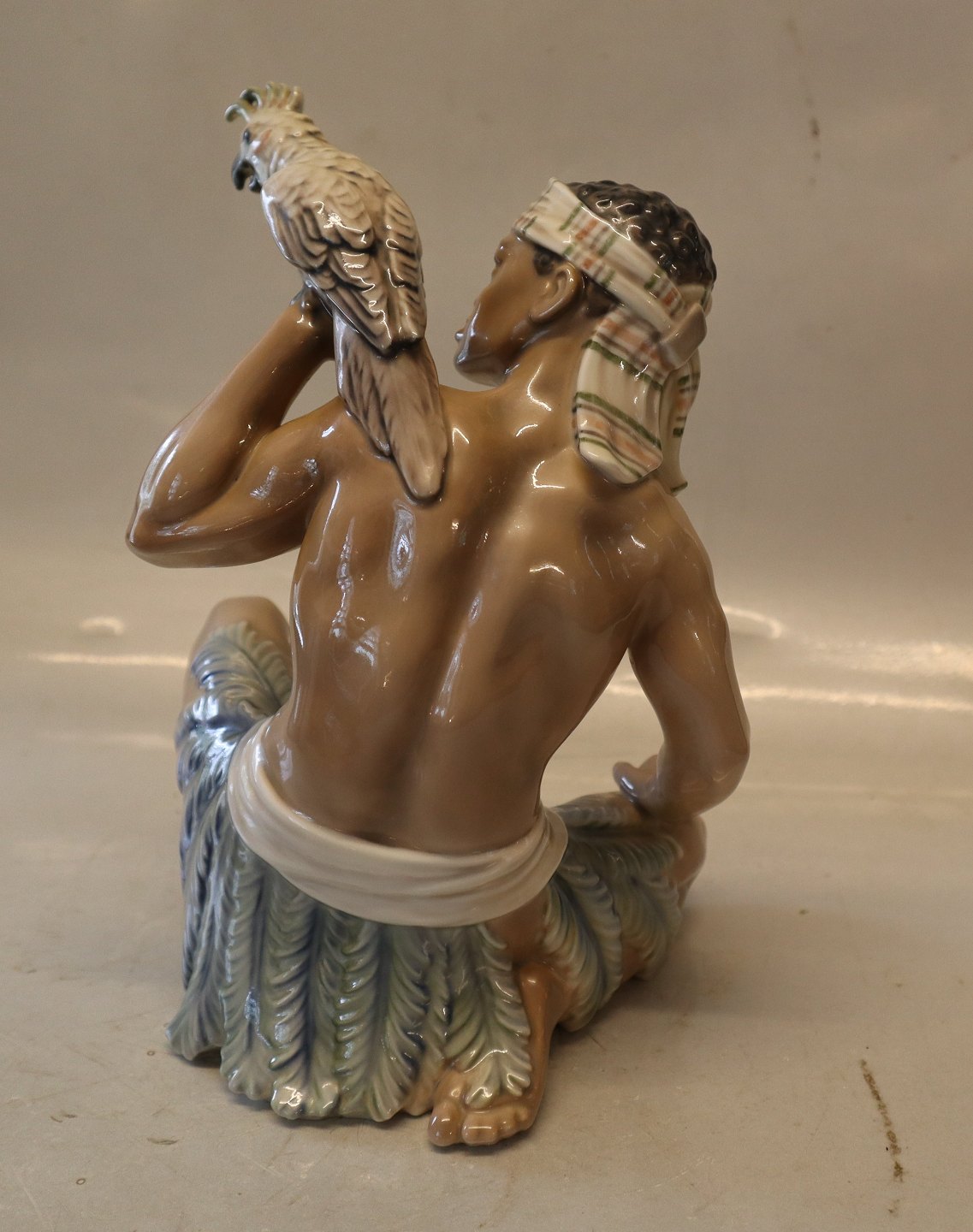 Dahl Jensen 1305 Sudaner med kakadue 23 cm (DJ). Orientalsk mand med fugl. Mærket med kongelig krone og DJ Copenhagen i hel og fin stand.1305 Sudanese Man with cockatoo (DJ) 23 cm