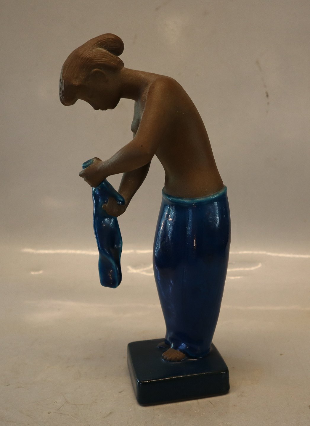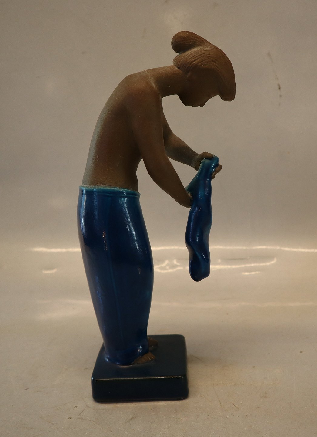 Beskrivelse: Johannes Hedegaard Royal Copenhagen stentøj 21424 RC "Martha" Kvinde med klæde 26 cm, JH, December 1956 I fin og hel stand Turkis glasur og chamotte