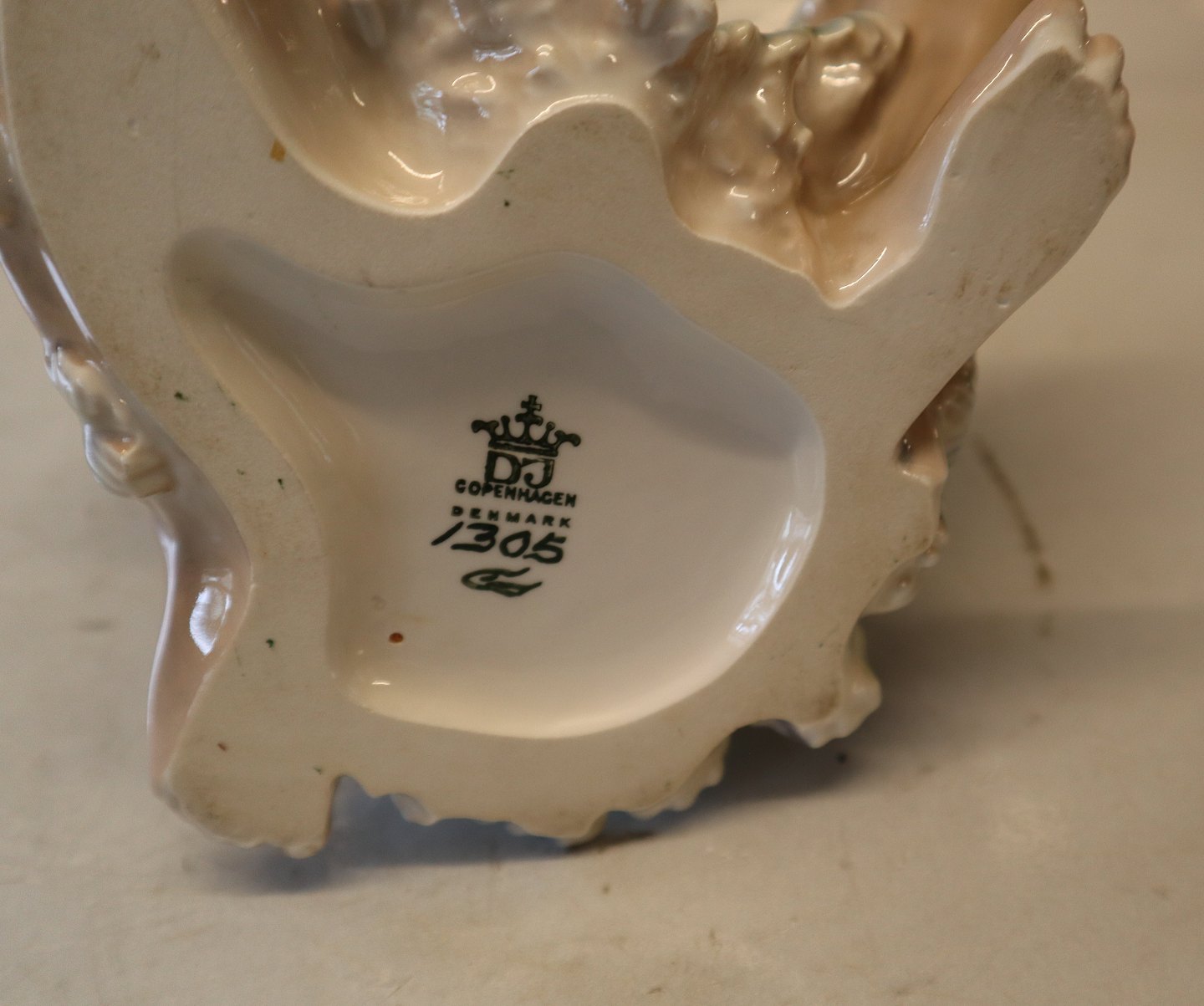 Dahl Jensen 1305 Sudaner med kakadue 23 cm (DJ). Orientalsk mand med fugl. Mærket med kongelig krone og DJ Copenhagen i hel og fin stand.1305 Sudanese Man with cockatoo (DJ) 23 cm