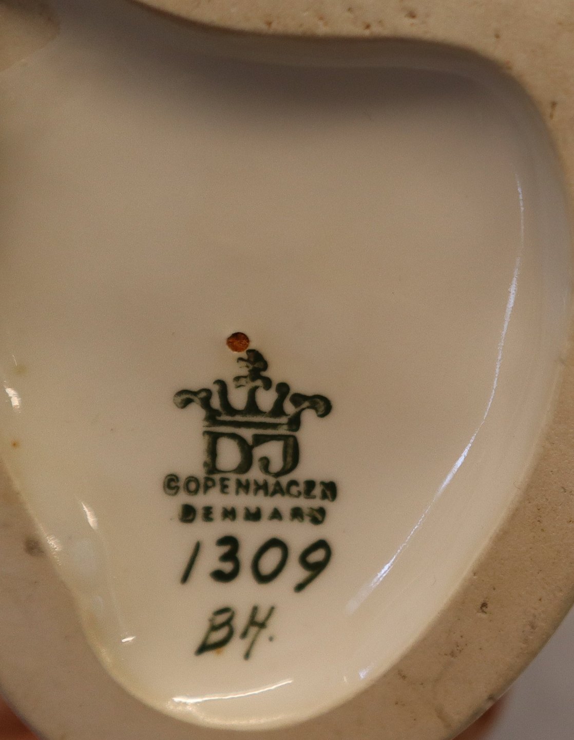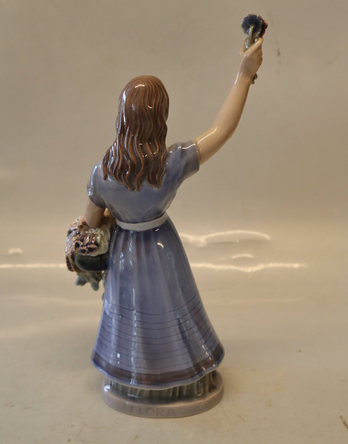 Beskrivelse: Dahl Jensen 1309 Flora 25,5 cm (DJ) Pige med blomster. Mærket med kongelig krone og DJ Copenhagen i hel og fin stand.