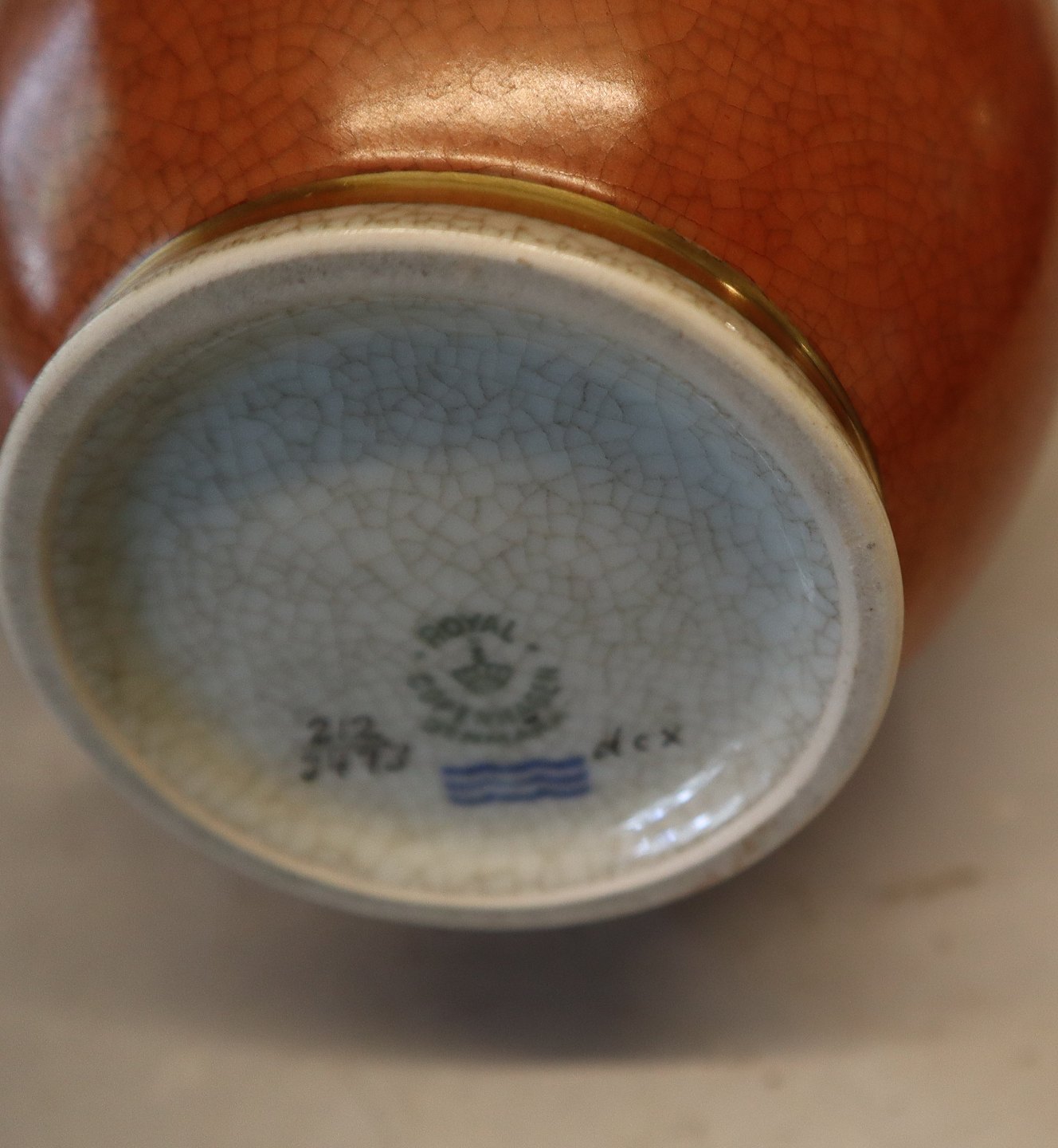 Beskrivelse: 212-3473 Kgl. Orange vase med gråt og guld 25 cm Kgl. Craquelé fra Royal Copenhagen I hel og fin stand